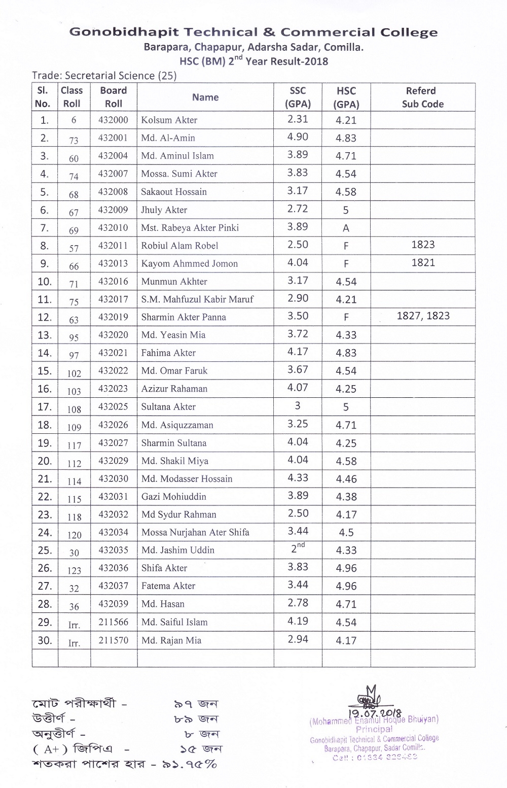 HSC (BM) Result 2018 (Secretarial Science)