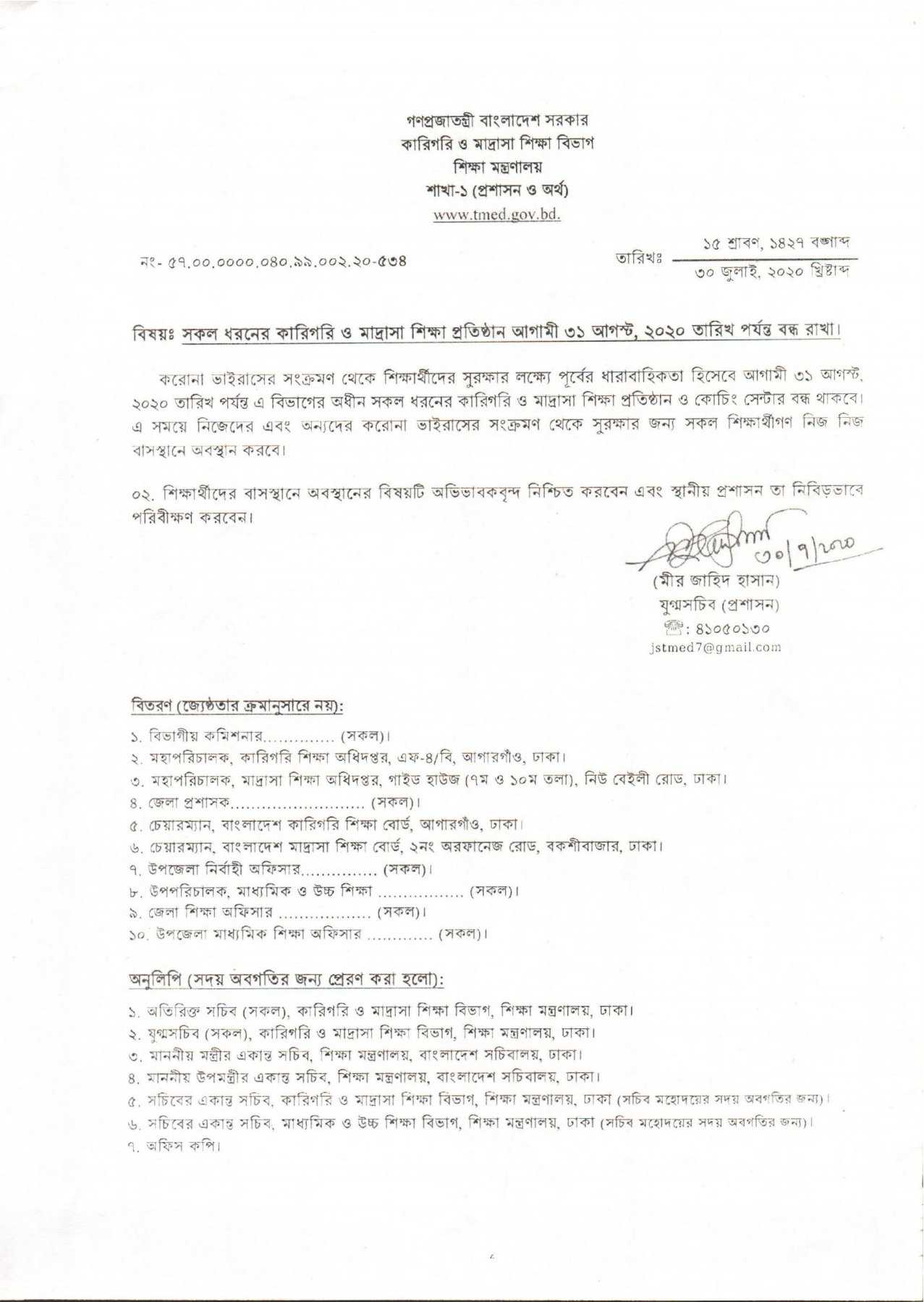 ৩১ আগস্ট ২০২০খ্রি. তারিখ পর্যন্ত প্রতিষ্ঠান বন্ধের নোটিশ