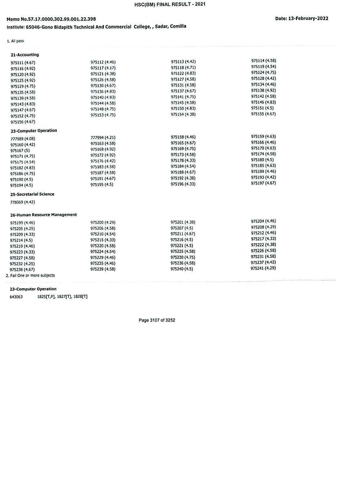 HSC (BMT) Final Result 2021