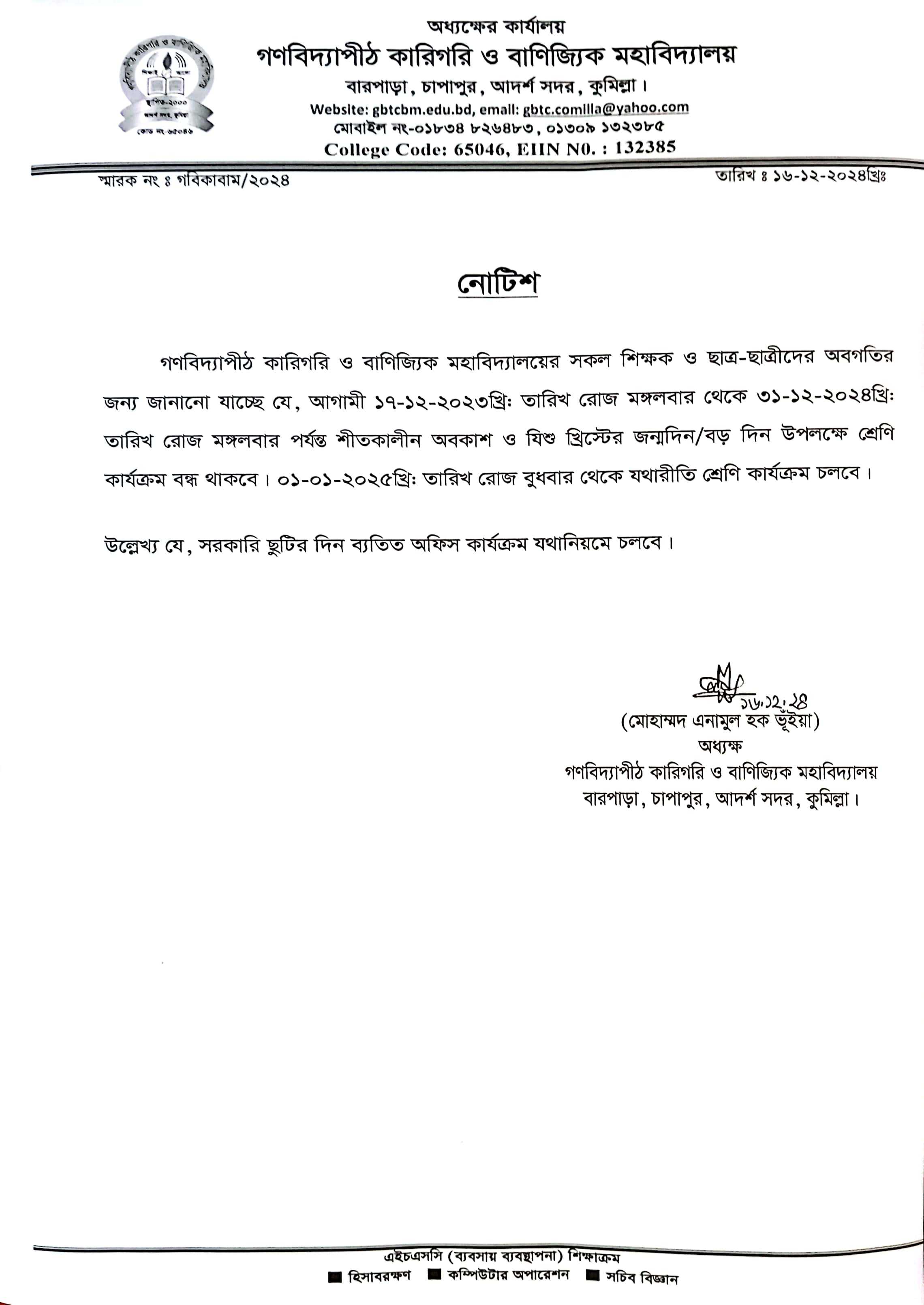 পবিত্র ঈদুল আযহা ও গ্রীষ্মকালীন অবকাশ উপলক্ষ্যে শ্রেণি কার্যক্রম বন্ধের নোটিশ।
