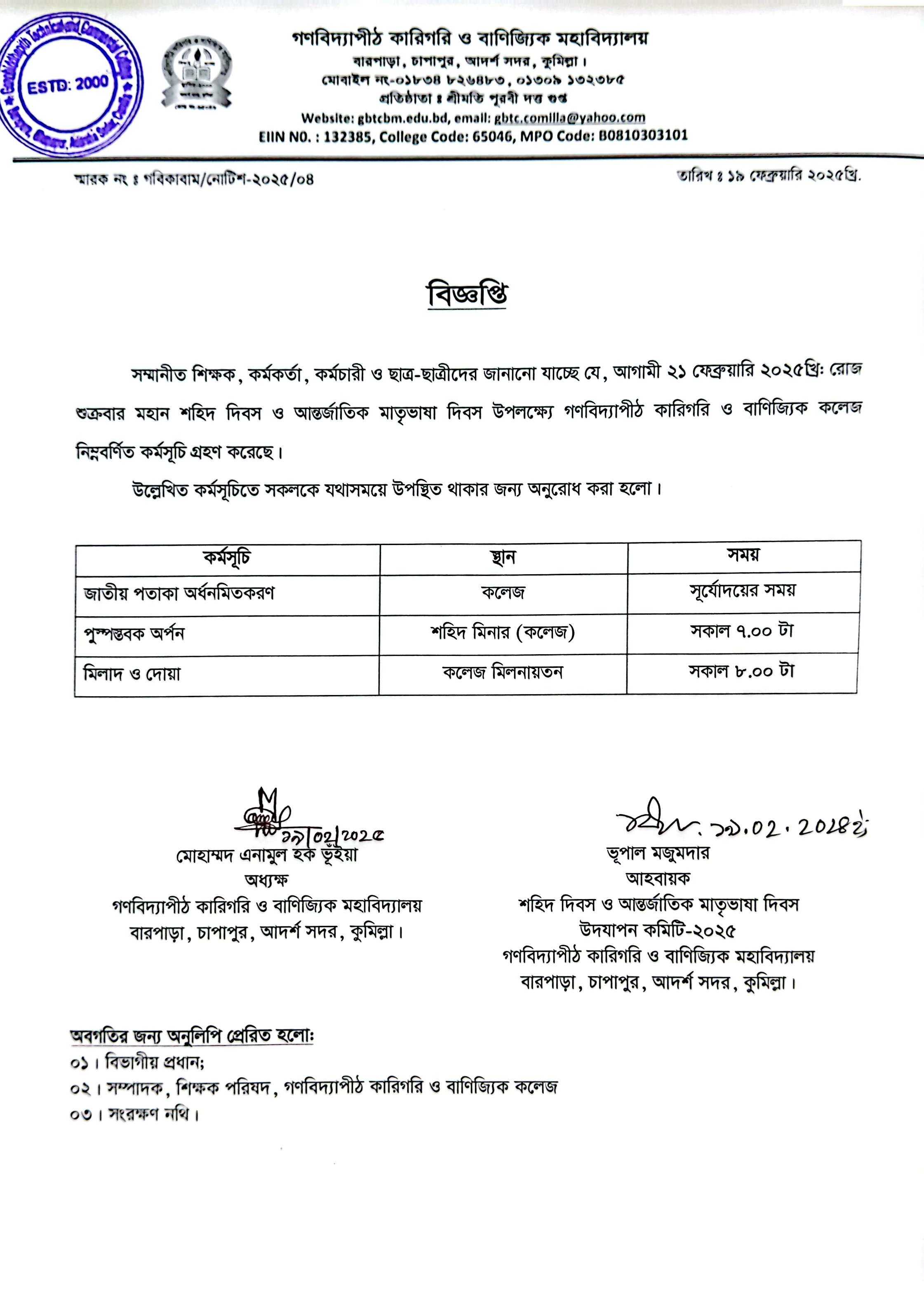 ২১শে ফেব্রুয়ারি শহিদ দিবস ও আন্তর্জাতিক মাতৃভাষা উদযাপন সংক্রান্ত নোটিশ