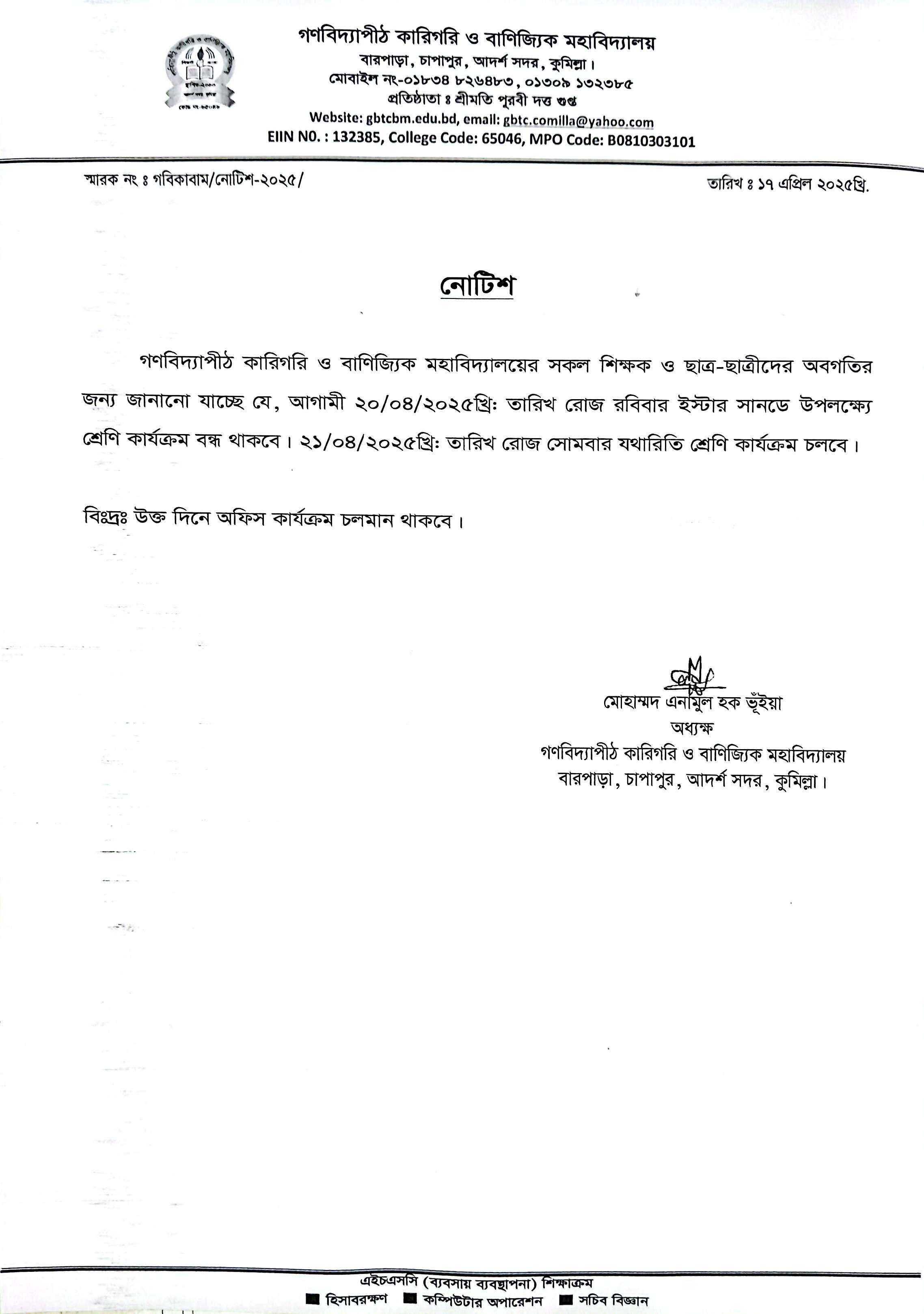 ইস্টার সানডে উপলক্ষ্যে শ্রেণি কার্যক্রম বন্ধের নোটিশ।