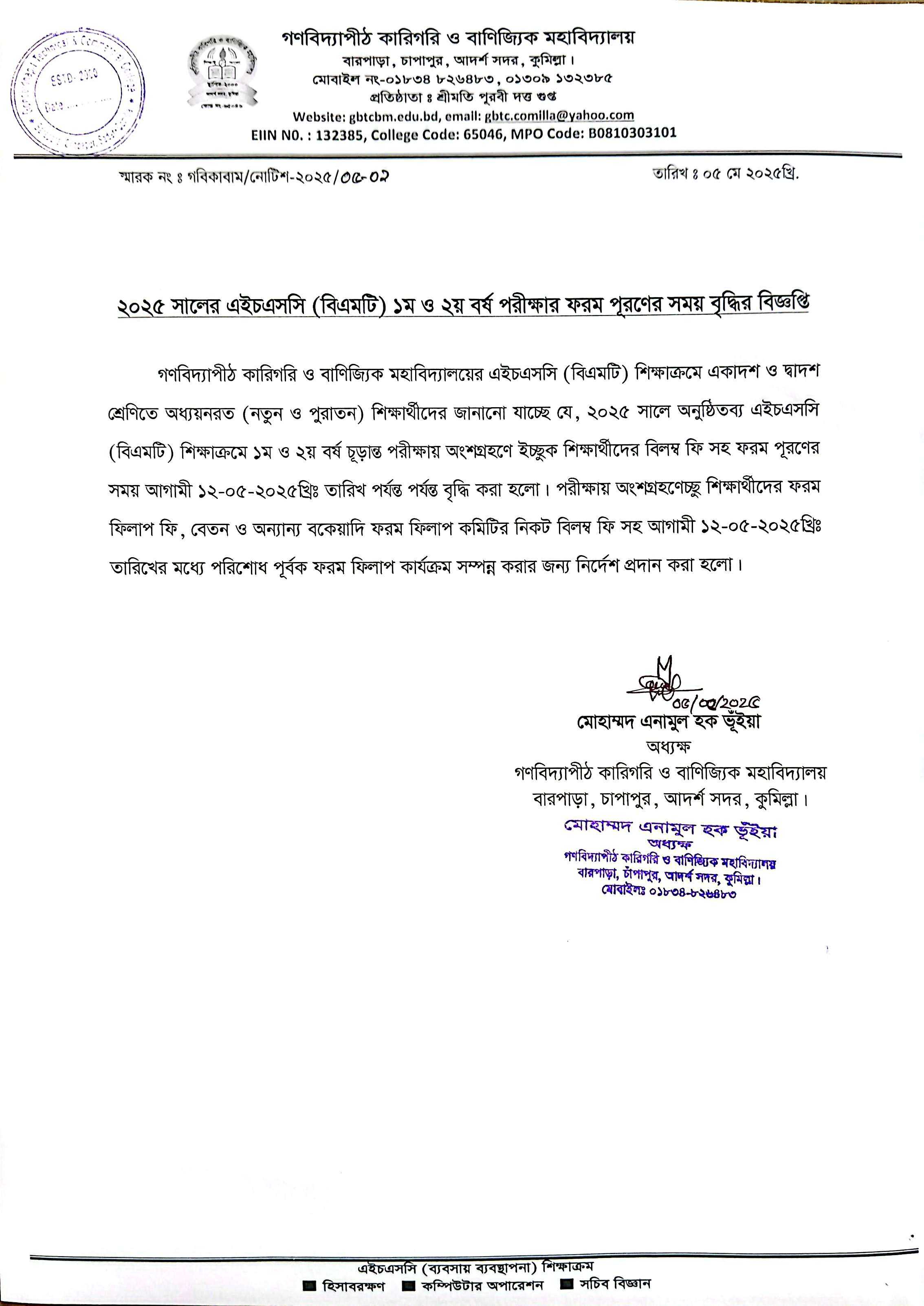 ২০২৫ সালের এইচএসসি (বিএমটি) ১ম ও২য় বর্ষ পরীক্ষার ফরম পূরণের সময় বৃদ্ধির বিজ্ঞপ্তি।