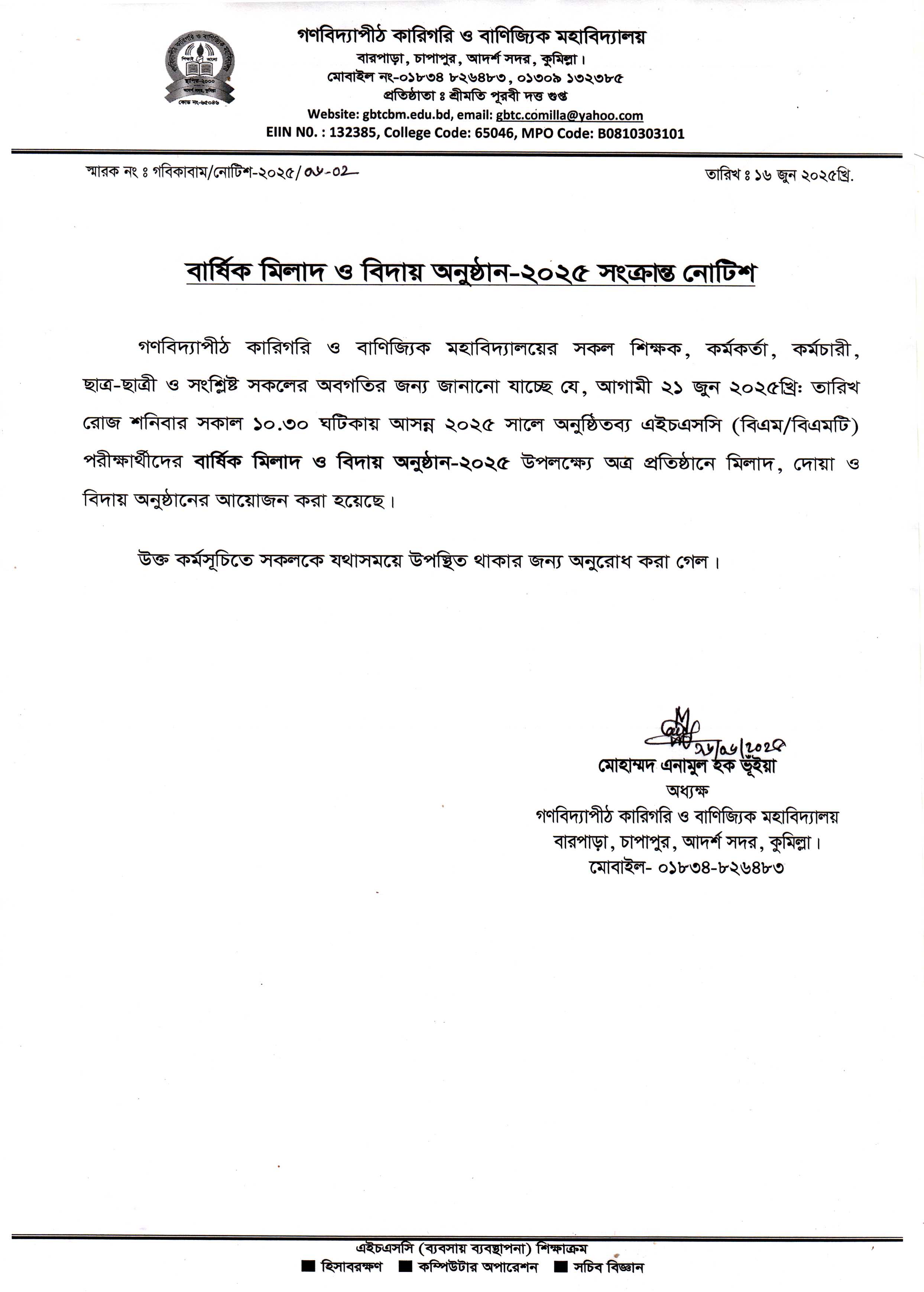 বার্ষিক মিলাদ ও বিদায় অনুষ্ঠান-২০২৫ সংক্রান্ত নোটিশ।
